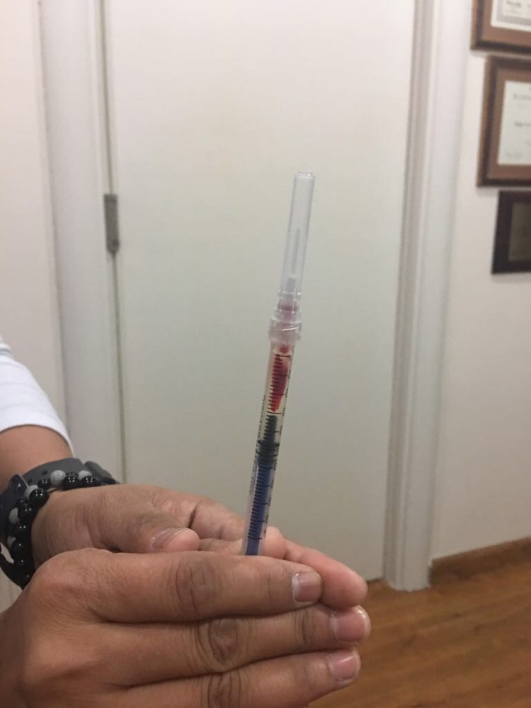 I know it is controversial, but as I am preparing to inject, I have the help of my nurse to keep her eyes on the injection site and the syringe. I always pull on the plunger withdraw and wait a few seconds. If she sees blood, she will tell me, “you are in!” I then withdraw the needle, get the syringe behind the chair where the patient is (the patient should not see it, of course) and I re-prepare the syringe again.